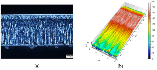In order to characterise the stereometry of the surface after fibre laser cutting, an analysis of the cut edges was performed with the use of an AltiSurf A520 confocal microscopy (Altimet, Chambéry, France). Macroscopic studies were carried out using a Nikon AZ100 stereo microscope with AZ Plan Apo 1x lens (Nikon Industrial Metrology, Tokyo, Japan). The geometry of the resulting cut surfaces was determined by examining the samples in confocal microscope. Due to the atypical structure of the stainless steel, a CL3 confocal sensor with a maximum measurement range of 1.2 mm was used, which allowed the focus on the foam cutting plane in order to continue measurements on a surface characterised by a high degree of waviness. With the microscope used, the examined surface can be tilted at a maximum angle of ±27° to the lens axis. The surface can be scanned with a vertical resolution of 25 nm, an accuracy of 60 nm and a range of 1.2 mm. The device allows full CNC control in five axes: X, Y, Z and two additional ones. The stepper motor resolution is 0.1 μm in the XY plane and 0.5 μm along the Z axis, while the resolution of each rotary axis is 0.0005°. The maximum dimensions of the sample can be 200 mm × 200 mm × 200 mm and the sample mass may not exceed 20 kg. The test consists in focusing white light on a measured surface so that the spot has the smallest possible diameter. The reflected light returns to the lens, passes through a chromatic lens and is scattered. The spectral band of the scattered light passes through the detector aperture. The background light reflected from the unmeasured surface is separated. Therefore, confocal examination with optical sensors provides high contrast and measurement accuracy [10,11,62,63,64,65].