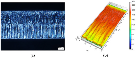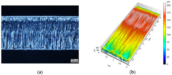 Macroscopic results from the stereo microscope are shown in Figure 5a, Figure 6a, Figure 7a, Figure 8a and Figure 9a. The AltiMapa 6 software, which was used to process the raw confocal microscope data, allowed the recorded topography to be analysed taking into account surface examination standards. The results are shown in Figure 5b, Figure 6b, Figure 7b, Figure 8b and Figure 9b.