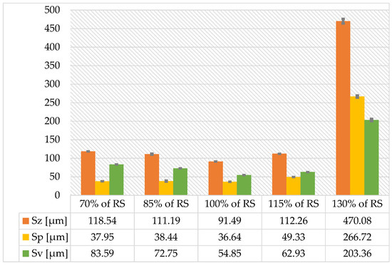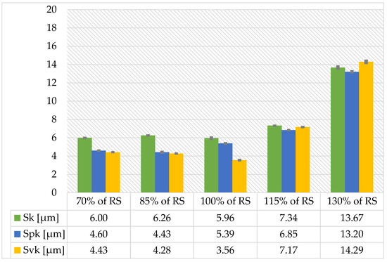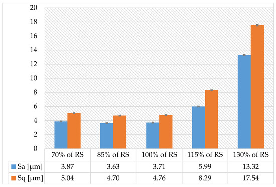 The value of Sa (arithmetical mean height of the scale limited surface) is the highest for a speed of 130% of RS. Optimum cutting parameters are speeds between 100 and 115% of RS. The same is true for the Sq parameter (root mean square height of the scale-limited surface). Surfaces with the smallest values of deviation of irregularities from the mean plane were recorded for samples made at 70% and 100% of RS, as illustrated in Figure 10.