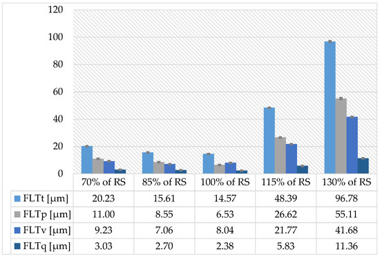 The flatness of the joined surfaces is a very important aspect of welding. The FLTt parameter (peak-to-valley flatness deviation of the surface) is lowest for 85% and 100% of RS. A weld of uniform strength along the entire length should be formed on the edges of long workpieces shaped in this way, and a weld made on the edge of workpieces cut at the most cost-effective speed of 100% of RS should look similar. The FLTt, FLTp (peak to reference flatness deviation), FLTv (reference to valley flatness deviation), FLTq (root mean square flatness deviation) parameters are highest at a cutting speed of 130% of RS, as shown in Figure 14.