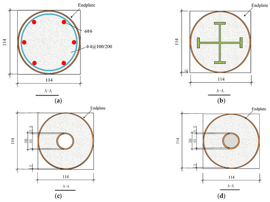 The validation of the models is based on an impact test of composite columns [23]. This numerical study simulates the impact resistance of composite columns with five different cross sections (shown in Figure 1A) under axial compression ratios of 0, 0.3 and 0.5, resulting in 15 combinations, which are calculated as N0/Nu, where N0 is the axial force applied in the test and Nu is the axial ultimate capacity of the specimen obtained from references [24,25,26,27]. The parameters of the columns are shown in Table 1 and the dimensions of the different sections are shown in Figure 1A [23]. To compare the impact resistance of members with different section types, the composite columns and reinforced concrete columns are designed to have the same outer diameters and use the same amount of steel. The outer diameter of the steel tube is 114 mm and the wall thickness is 2 mm. For solid concrete-filled double steel tube (S-DS) and hollow concrete-filled double steel tube (H-DS) sections, the inner circular steel tube diameter is 50 mm and the wall thickness is 2.5 mm. The size of the cross-sectional structural steel of S-ST columns (Figure 1(Af)) is 57 mm × 14 mm × 2 mm × 3 mm (h × b × t1 × t2). The longitudinal reinforcement diameter (D) of steel tubular-encased reinforced concrete (R-ST) and reinforced concrete (RC) members is 6 mm, and the stirrup diameter (d) is 4 mm. There is a 300 mm long plastic hinge zone at both ends of the specimen, where the stirrup spacing is 100 mm. Stirrup spacing is 200 mm outside the plastic hinge zone. The member length is 1800 mm for all.