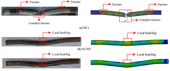 Figure 4 shows a comparison of predicted and observed failure modes for RC columns and composite columns. The residual deformations of the model include the overall flexural deformation, local buckling deformation of the outer steel tube and fractures. A more detailed comparison in terms of forces and displacements is presented in this section.