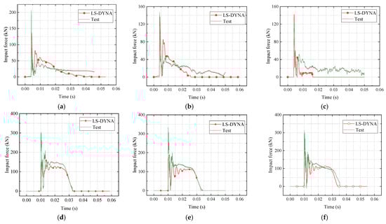 Figure 5 shows the comparison between the predicted and measured impact force–time histories of five composite column specimens. It can be seen that, except for the RC column, all composite sections fit well with the test results. This is because the RC column suffered severe impact damage and the CSCM concrete material model of LS-DYNA cannot accurately simulate concrete damage.