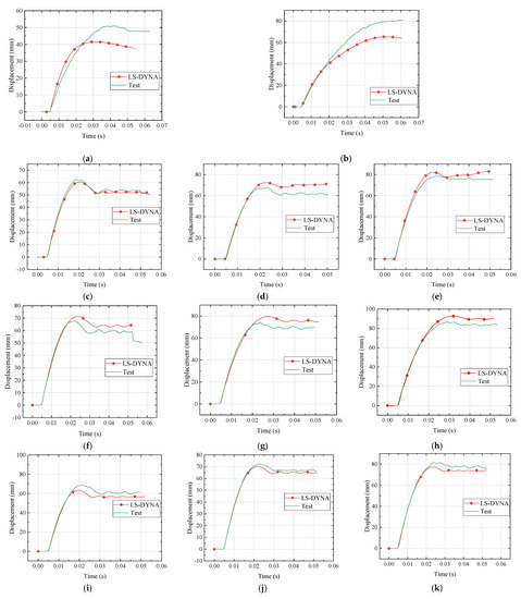Figure 6 shows the comparison of predicted and measured mid-span displacement–time histories of five column specimens with different cross sections. It can be seen that, consistent with the impact force–time history curves, the mid-span displacement of the simulated RC column deviates from the test result due to the limited capacity in simulating severe concrete damage.