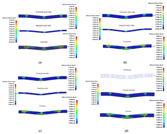Figure 9 shows the equivalent plastic strain of RC, H-DS, S-DS, S-ST and R-ST components impacted by a drop hammer. The red area indicates high plastic strain. It can be seen from the figure that plastic deformation mainly occurs at the impact location and the support locations where there are maximum bending moments. The maximum deformation position of each component is similar, appearing in the middle and lower part of the span and the upper part of the support. The failure modes of internal and external steel tubes and concrete are similar.