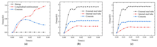 Figure 10 shows the internal energy–time history curves of RC, H-DS, S-DS, S-ST and R-ST components. As can be seen from Figure 10, for RC members, the energy absorbed by concrete is slightly greater than that absorbed by steel bars in the early stage of impact, mainly because at this time, concrete produces a large number of cracks due to impact and, thus, absorbs a large amount of energy. In the post-impact period, due to the concrete crack failure resulting in its main energy being absorbed by steel bars, at this time, the energy absorbed by steel bars is far greater than the energy absorbed by concrete. Due to the bending deformation of the specimen, the role of the stirrup is limited and it can hardly absorb energy. For H-DS and S-DS members, their deformation is nearly the same; the energy absorbed is similar. The main energy is absorbed by steel tubes, of which the outer steel tube absorbs most of the energy, about 4.7 kJ (52.24% of the impact energy), followed by concrete, about 2.1 kJ (22.95% of the impact energy), and the inner steel tube absorbs the least energy, about 1.0 kJ (10.93% of the impact energy). For S-ST members, most of the energy is absorbed by the external steel tube, about 5.43 kJ (59.34% of the impact energy), followed by concrete, about 2.23 kJ (24.37% of the impact energy), and the energy absorbed by double H-shaped steel is the lowest, about 1.11 kJ (12.13% of the impact energy). For R-ST members, the main energy dissipation is still absorbed by the external steel tube, about 5.43 kJ (59.34% of the impact energy), followed by concrete, about 2.19 kJ (23.99% of the impact energy), then the energy absorbed by longitudinal reinforcement, about 1.0 kJ (10.93% of the impact energy), and finally the energy absorbed by stirrups, about 2.75 J (0.003% of the impact energy).