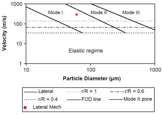 In the present study, under the silica erodent with impact velocities of V = 170 m/s and V = 300 m/s and an average diameter 2R = 60 μm, the erosion regime is identified to be the Mode I (erosion-lateral cracking/near-surface plasticity) by using the erosion map [10,12,21], as indicated by the red point in Figure 2, where the lateral cracks are mostly located at the near-surface region as a result of small-particle erosion [8]. By using the erosion map, the radius of the contact point between erodent and target materials r ≈ 58.51 μm/s for V = 300 m/s and r ≈ 44.23 μm/s for V = 170 m/s is also obtained, respectively.