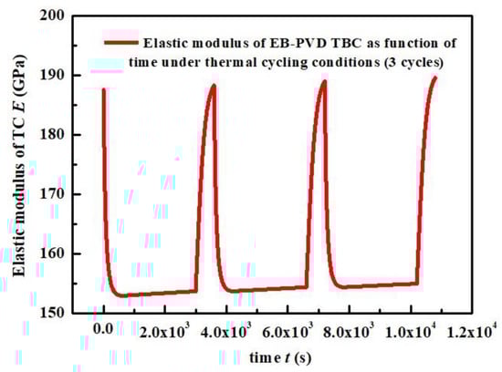 It is difficult to measure elastic modulus during the thermal cycling process. Therefore, in the present study, it is assumed that an increase in elastic modulus during cooling follows the same pattern as that of the elastic modulus upon heating. Additionally, within the dwell period during thermal cycling, elastic modulus is affected by high-temperature sintering. During a thermal cycling period, as the duration of both heating and cooling processes is much shorter than a high-temperature dwell period, the effect of sintering on modulus changes can be neglected for the heating/cooling process [15].