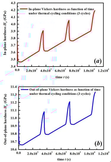 and are time-dependent Vickers hardness; , and are fitting parameters for the in-plane hardness where , (i = 1, 2) and are fitting parameters for the out-of-plane hardness, respectively. The values of fitting parameters are tabulated in Table 2. The calculated Vickers hardness as a function of high-temperature dwell time at 1400 °C is illustrated in Figure 8.