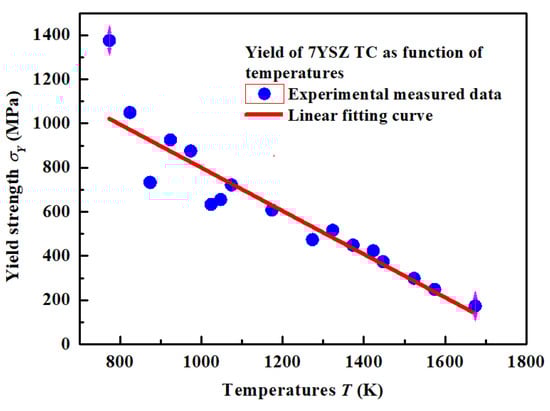 The yield strength of the target material plays a significant role in determining the critical velocity for deformation wear in Equation (8). The temperature-dependent yield strength of 7YSZ material was used in [44], where the yield strength decreased as temperature raises. The experimentally measured yield strength with a linear fitting is illustrated in Figure 10.