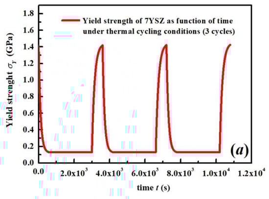 The calculated yield strength of 7YSZ topcoat of EB-PVD TBCs versus time (a) for three cycles and (b) during high-temperature dwell period.