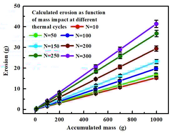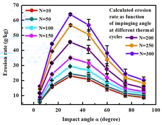 Similar to the results from Figure 18, the temperature-dependent erosion behavior and sintering effect dominate at the early stages and at the late stages of thermal cycles, respectively. Pseudoductile erosion is found for the erosion curves, where the maximum erosion rates are identified at nearly 30° at either the earlier or later stages of thermal cycles.