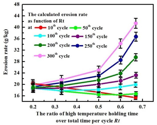 The effect of high-temperature dwell time on erosion is discussed based on parameters tabulated in Table 9. The erosion rates are calculated versus the ratio Rt from 0.2 to 0.67 at various stages of thermal cycles in Figure 17.