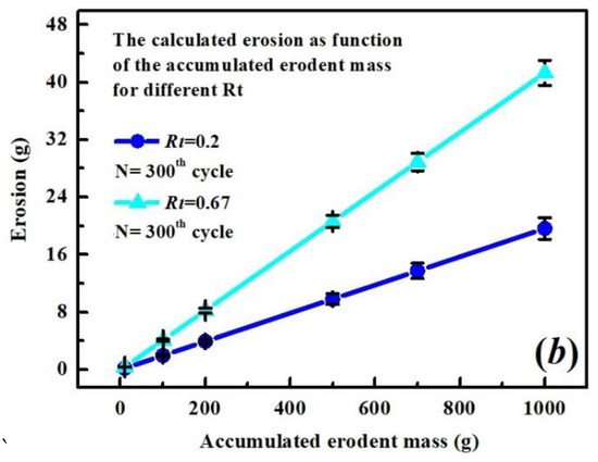 The calculated erosion versus accumulated mass with selected ratios Rt at specific stages of thermal cycles; (a) N = 10, (b) N = 300.