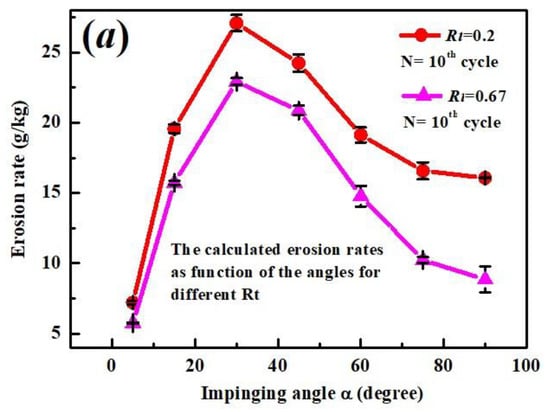 The erosion rates are also investigated versus impact angles at selected ratio Rt (Table 11). The calculated erosion rates are shown in Figure 19, with Rt from 0.2 to 0.67.