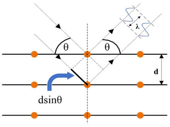 Figure 6. X-ray diffraction principle, where d is the crystal plane spacing, θ is the angle of incidence, and λ is the wavelength of the beam.