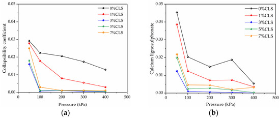 According to Equation (1), the collapsibility coefficient of improved loess under different pressures and admixtures is derived using the single and double-oedometer methods, respectively, as shown in Figure 7. As can be seen from the figure, the collapsibility coefficients measured by the two methods showed the same trend of change. That is, at a pressure of 50 kPa, the CLS-improved loess with different contents showed strong collapsibility. With increasing pressure, the collapsibility decreased significantly, and the collapsibility coefficient showed a trend of rapid decrease and then stabilization. Under the pressure condition of 400 kPa, the collapsibility coefficient of the improved loess with different CLS contents dropped to below 0.015, and behaved like non-collapsible loess.