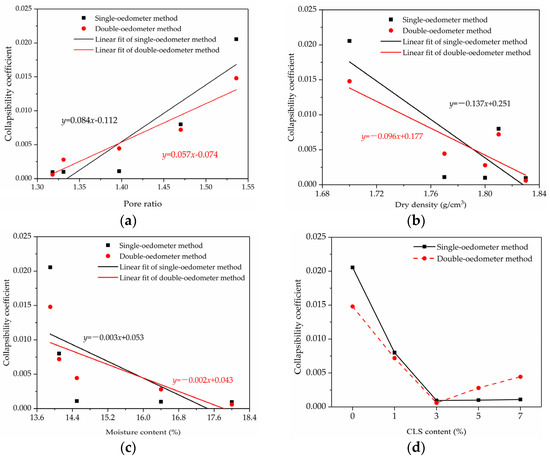 The correlation between pore ratio and dry density on the collapsibility coefficient was similar, and was also the main factor affecting the collapsibility of CLS-improved soil. The collapsibility coefficient is negatively correlated with dry density and positively correlated with the pore ratio [30]. This means that when the dry density is larger, the pore ratio decreases, the soil structure is more compact, and external water cannot enter easily to increase collapsibility.