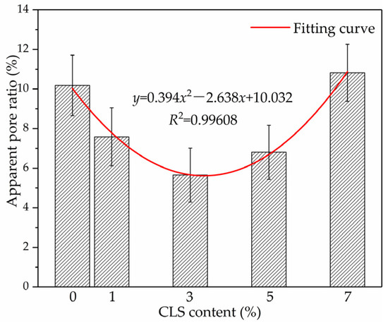 According to the results in Figure 14, the relationship between the content of CLS and the apparent pore ratio can be further fitted as: