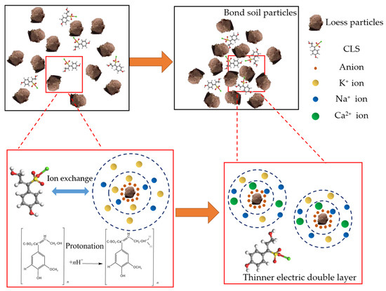 where L is the crystalline size (nm), k is Scherrer constant (0.89 in this study), λ is the wavelength of X-radiation (1.540538 Å), and β is the width of a peak at half height expressed in 2θ (rad). Table 6 shows the grain size of each mineral fraction before and after CLS modification. It can be seen that the average grain size of each mineral composition was reduced after the incorporation of CLS, and the degree of reduction was more than 50%. The decrease in grain size is closely related to the structural changes in the soil and the degree of cementation between minerals [44]. It is inferred that under the effect of ion exchange and protonation (Figure 18), the positive charge of CLS neutralizes the negative charge on the soil surface, thus reducing the thickness of the double layer and making the mineral composition more aggregated and denser [45].