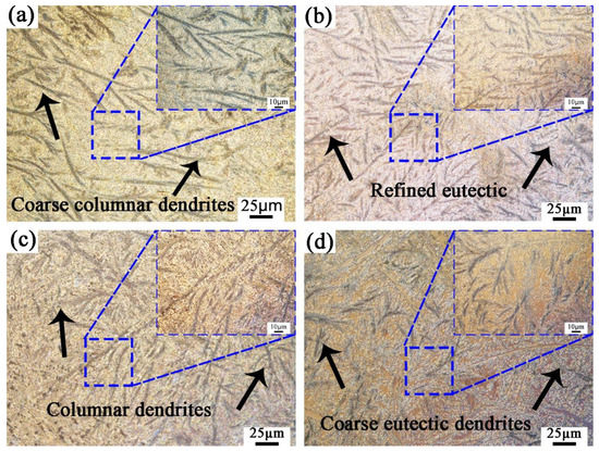Figure 1 shows the macroscopic morphologies of the surface of Ni60 composite coating with the addition of 6.0%CeO2 at different heat treatment temperatures. Figure 1a shows the macroscopic morphology of the composite coating at room temperature. Thus, it may be deduced that the cladding layer is mostly composed of coarse columnar dendrites and the microstructure uniformity is poor. This is because the precipitation of Fe5C2 enhanced phase in the 6.0%CeO2/Ni60 cladding layer is inhibited by excessive rare earth element, Ce, which leads to the reduction of the refining effect of Fe5C2 on the coarse dendritic eutectic in the coating. Under these conditions, the intrinsic microstructure of the cladding zone is mostly composed of Ni and Cr enriched phases, and the dendritic eutectic with increasing size of (Ni, Fe) + Fe5C2 + Cr23C6 eventually leads to the formation of microstructure defects [23]. Under the condition of heat treatment at 500 °C, the dendritic eutectic structure was uniform, and there is obvious tendency for the dendrite structure to be significantly refined compared with the non-heat-treated structure, as shown in Figure 1b. Compared with the cladding zone at 500 °C, the microcosmic organization and homogeneity of the composite coating at 600 °C have different changes, as shown in Figure 1c. First, coarse columnar dendrites coexist with tiny dendrites, and the dendrites have a certain tendency to grow compared with that of 500 °C. Secondly, it can be observed that the uniformity of the microstructure has decreased to a certain extent. When the heat treatment temperature reaches 700 °C, the microstructure is mainly composed of coarse eutectic, which presents a dispersed sparse distribution. According to the analysis of the experimental results, the microstructure of the cladding layer has been refined significantly under the 500 °C heat-treatment condition.