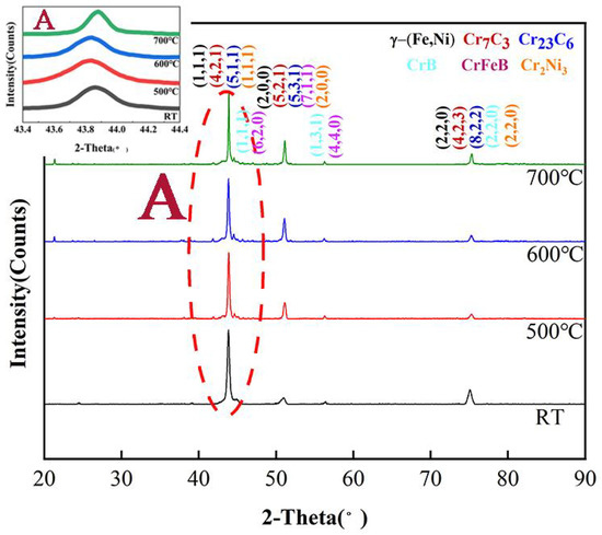 Figure 2 indicates XRD patterns of composite coating with 6.0% CeO2 additive amount at different annealing temperatures. From Figure 2 it can be seen that the main components of the coating are γ-(Fe,Ni),Cr7C3,Cr23C6,CrB, CrFeB and Cr2Ni3. Hard phases Cr7C3, Cr23C6 and CrB fully raise the hardness but also increase the brittleness of the cladding layer. The appearance of Cr2Ni3 phase is a result of the fusion of matrix materials. As we all know, the narrower the half-peak width of the XRD pattern, the larger the grain size. The left shift of the diffraction peak represents the increase in the half-peak width of the XRD pattern. From Figure 2 it can be seen that under the condition of heat treatment at 500 °C, the diffraction peak shifts significantly to the left, which proves that the width of the half-peak increases. It can be inferred that the grain size decreases under such experimental conditions. Under the conditions of 600 °C and 700 °C, the XRD patterns have different degrees of right movement, which shows that the grain size increases under these heat treatment conditions. The FWHM value measured by integral method can be used to compare the half-peak width at different heat treatment temperatures, which can indirectly assess the grain size variation at different heat treatment temperatures. The half-peak widths at 25 °C, 500 °C, 600 °C and 700 °C are 3.49, 3.91, 3.32 and 2.71, respectively. It can be concluded that the half-peak width is the maximum under the heat treatment condition of 500 °C, and it follows from what has been said that the particle size of the cladding coating is relatively small under this condition, which also confirms the conclusion drawn in Figure 1.
