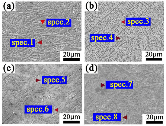 Figure 3 shows the microstructure evolution after different heat treatment temperatures. The micromechanism of the complex coating under 25 °C, that is, without heat treatment, presents obvious coarse and sparse microstructure. The cladding layer is mainly composed of coarse columnar crystals, as shown in Figure 3a. Figure 3b shows the microstructure of the complex coating after 500 °C annealing. The micromechanism consists mainly of components of closely and evenly distributed dendrite crystals and the original coarse dendrites are fully refined. Figure 3c shows that under the experimental condition of heat treatment temperature of 600 °C, the microstructure refinement effect of the cladding layer can be seen to be significantly reduced. Under these conditions, relatively coarse dendrites reappear in the cladding coating, decreased the uniformity of the microstructure. When the heat treatment temperature is 700 °C, it can be found that the cladding layer has obviously coarse dendrites randomly distributed, and obvious segregation phenomenon can be seen in the tissue, as shown in Figure 3d. Combined with the above analysis and the microstructure of the cladding layer shown in Figure 3, it can be seen that the microstructure of the Ni60 cladding layer with 6.0%CeO2 after the heat treatment experiment is improved to different degrees compared with that under 25 °C. When the heat treatment temperature is 500 °C, the particles’ refining effect in the micro-organization is the best, and the homogeneity of the microstructure is obviously improved.