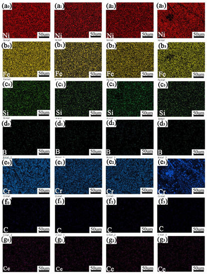 Figure 4 demonstrates the elements distribution of the Ni60 cladding layer containing 6.0%CeO2 at several annealing temperatures. The degree of segregation of each element is different. In the four cases, the segregation severity of Ni, Fe, Si and Cr elements are more intense than that of B, C and Ce elements. In the cladding layer without heat treatment, it can be observed that the segregation of Si and Cr elements is obvious, as shown in Figure 4a0–g0. This is because the excessive addition of Ce in 6.0%CeO2 resulted in the conversion of excess Ce from dissolution and segregation along the crystal boundaries during solidification [24]. The latent heat of phase transition emitted by the second phase compound at the crystal boundaries reduces the degree of supercooling and finally results in the columnar crystals. When the heat treatment temperature is 500 °C, it can be seen that the segregation of each element is significantly improved as can be seen in Figure 4a1–g1. The reason for the improvement of element segregation is that the reasonable temperature increases the diffusion of the elements in the sample, and the inhibition of CeO2 on the segregation of elements in the clad coatings is further enhanced. When the heat treatment temperatures are 600 °C and 700 °C, it can be seen from Figure 4a2–g2 and a3–g3 that the segregation of Ni, Cr and Fe elements causes the uneven distribution of elements in the cladding layer, resulting in the decrease in the uniformity of the cladding layer structure. The above experimental results show that appropriate heat treatment temperature (500 °C) can effectively inhibit the segregation of elements, so as to effectively improve the uniformity of the distribution profile of elements in the clad coatings.