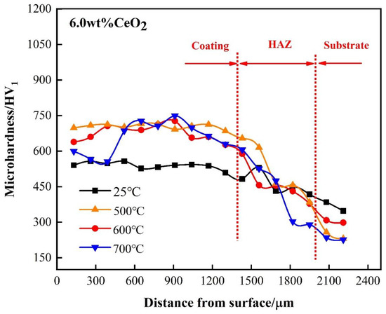 Figure 5 displays the microhardness allocation of 6.0%CeO2 clad coatings at disparate annealing temperatures. The change of microhardness value directly affects the quality of cladding layer [25]. Generally, the microhardness distribution curve of the cladding layer can be divided into three sections, as shown in Figure 5. Along the cross section of the sample from top to bottom, it can be divided into the surface cladding region, the intermediate bonding region between the cladding layer and the matrix and the final 35CrMoV matrix region. In this experiment, the hardness of the coating was characterized by HMAS-D1000SZ micro-Vickers hardness tester. The loading force was 9.8 N and the duration was 15 s. For the accuracy of the test, three points were taken at equal distances to test the hardness. The distance was 0.5 mm apart, and the average value was taken as the final result. Average microhardness of samples after 25 °C, 500 °C, 600 °C and 700 °C heat treatments are 539.45 HV1, 732.37 HV1, 677.41 HV1 and 658.19 HV1, respectively. Microhardness of the clad coatings is the lowest under the heat treatment condition of 25 °C, and the hardness fluctuation is larger at the bonding zone. This is caused by the poor bonding performance. Additionally, the serious element segregation in non-heat-treated samples, which leads to the uneven structure, also contributes to the fluctuation hardness behavior. When the heat treatment temperature is 500 °C, the microhardness of the coverage shows an overall increase and the hardness curve is smoother than at other temperatures. At a reasonable heat treatment temperature, the grains of the coverage including 6.0%CeO2 are obviously refined, and the microstructure uniformity reaches the optimal. As a consequence, the hardness curve of the cladding layer is relatively smooth. The reinforced phase formed by Cr and B in the cladding layer increase the hardness of the cladding layer obviously. Under the experimental conditions of the heat-treatment temperatures of 600 °C and 700 °C, it can be observed that the hardness curve of the cladding layer fluctuates obviously. Combined with microstructure and phase analysis, the effect of grain refinement in the cladding layer is reduced. It can be inferred from the EDS diagram that the reduction of B compounds is one of the reasons for the fluctuation of hardness values. Combined with the above conclusions, the heat treatment can uplift the rigidity of Ni60 coverage containing 6.0%CeO2 to a certain extent. Under the condition of 500 °C, the rigidity of coverage obviously augmented, and the fluctuation range of microhardness is the smallest.