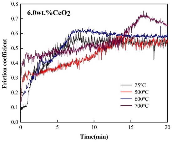 The friction coefficient can also reflect the wear performance of the cladding layer. In order to better understand the friction coefficient change of the Ni60 cladding layer with 6.0%CeO2 under different heat treatment experimental conditions, wear tests under unified test parameters (the load was 5 N and the test time was 20 min) were carried out on the samples after different heat treatment temperatures. The friction coefficient evolution can be seen in Figure 7. The friction factor of the cladding layer at 500 °C is significantly reduced compared with the other three heat treatment temperatures. The friction factors of coatings at 25 °C and 700 °C are almost the same. The friction factor of coatings at 600 °C shows instability, which is consistent with the characteristics of the three-dimensional morphology.