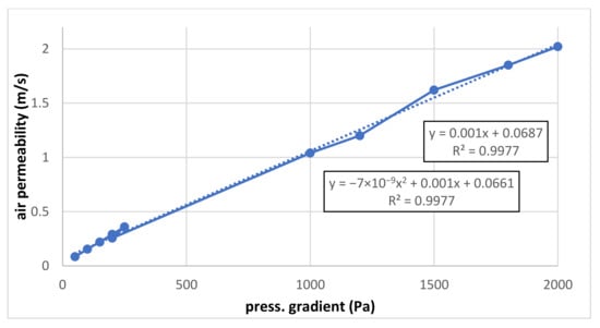 Figure 4 shows the air permeability for higher pressure gradients (200–2000 Pa). Compared with Figure 3, the linearity is slightly worse and the absolute term is a little higher. The lower slope (coefficient value of linear term) compared to small pressure gradients is probably given by the flow being measured at the pressure side, whereas, for small pressure gradients, the flow is measured at the suction side. Some deviations from the ideally linear course are probably given by some errors in measurement or evaluation.