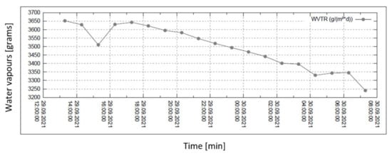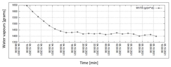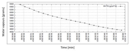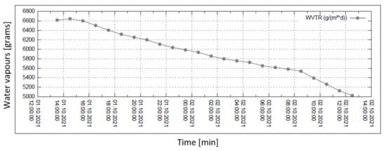 In all graphs, the permanent decrease in water vapour permeability during the entire measuring process (24 h) is evident. This should mean that the permeability of the same sample is decreasing (providing that the partial pressures of water vapour before and after the sample remain constant during the whole measuring process). It might also mean that the samples are progressively clogged, most probably by humidity.