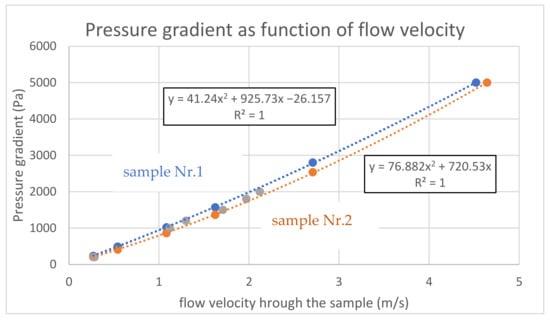 Subsequently, the air permeability was measured up to 5000 Pa for samples 1 and 2. The summary of the results for both samples are shown in Figure 12, completed by the former results of sample No. 1 for pressure gradients up to 2000 Pa. The quadratic correlation for the measured points is perfect and in accordance with the theoretical combination of linear (Darcy) and quadratic (Weissbach, Moody) terms. The absolute term of one sample is correctly equal to zero (for zero flow, there is zero flow resistance), and a non-zero value of the second sample means a measurement or evaluation error.