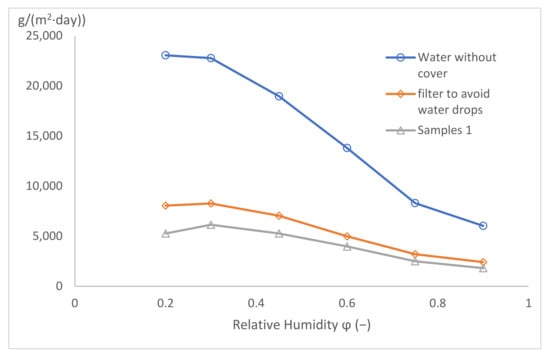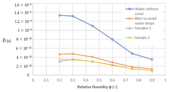 The water temperature before the samples is 40 °C (saturated vapour of pressure 7375 Pa) for all realized measurements, and the relative humidity behind the samples is set and kept in the range of 20–90% R.H. and at the same temperature of 40 °C. In this way, the pressure gradient is set up to 6000 Pa for the penetration of the vapour through the samples.