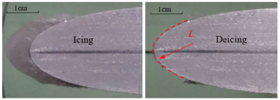 According to the above experimental condition, a typical shape of icing and de-icing blade airfoil is shown in Figure 4. In order to quantitatively analyze the icing characteristic of the blade of the wind turbine, the adhesion strength is calculated as follows: