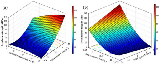 The interactive effect of wind speed and salt content can be seen in Figure 7b. It shows that when the salt content is at a high level, the effect of wind speed on the ice adhesion strength is not obvious, but when the salt content is at a low level, the effect of wind speed on ice adhesion strength is enhanced. This is because when the salt content is small, the effective solid–solid contact area of the ice–airfoil interface does not change obviously with the change in wind speed. The ice adhesion strength is mainly affected by wind speed. When the ice content is at a high level, more brine is expelled out, causing the effect contact area of the ice and airfoil changing smaller. At this time, the adhesion strength of ice is low and almost not affected by wind speed.