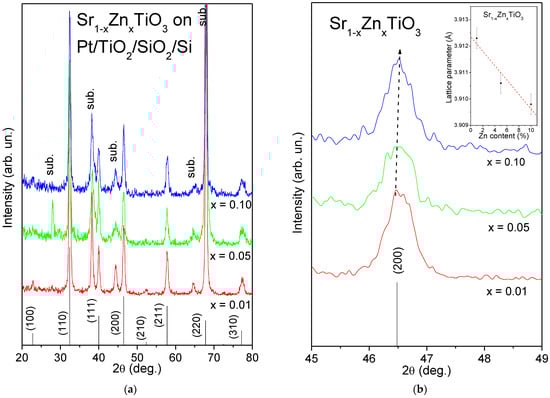 Regarding Sr-site Zn-substituted ST, no ferroelectric phase transition but low-temperature dielectric permittivity increase with Zn content was reported in weakly (up to 0.9%) doped Sr1−xZnxTiO3 ceramics sintered at 1400 °C by Guo et al. []. On the other hand, the room-temperature dielectric permittivity was reported to decrease with increasing ZnTiO3 content in sol-gel derived SrTiO3/ZnTiO3 heterostructures annealed just at 750 °C by Li et al. [] thus omitting the problem of high-temperature Zn volatility []. However, no low-temperature dielectric characterization was reported so far on moderately Sr-site Zn-substituted ST films. Therefore, in this work, we performed a structural, compositional, microstructural as well as variable temperature dielectric characterisation of sol-gel-derived Sr1−xZnxTiO3 thin films with x = 0.01, 0.05, and 0.10, deposited on Pt/TiO2/SiO2/Si substrates and annealed at 750 °C.