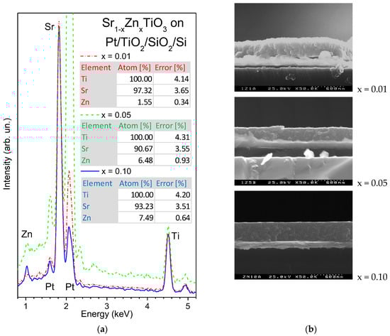 Energy-dispersive spectra (a) and SEM cross-section micrographs (b) for Sr1-xZnxTiO3 thin films with x = 0.01, 0.05, and 0.10 deposited on Pt/TiO2/SiO2/Si substrates. The spectra quantification results are also presented in (a).