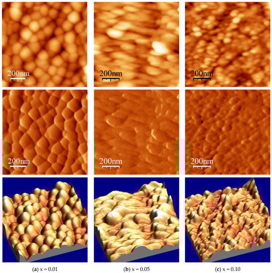 From the AFM topological images, shown in Figure 3, the root mean square (RMS) roughness of the films is estimated to be below 2.7 nm, implying the applicability of the films for reliable macroscopic dielectric characterisation. The films reveal also a dense and crack-free microstructure with an average grain size of about 141–145 nm for x = 0.01 and 0.05 decreasing to 86 nm for Zn content of 10%, as also shown in Table 1 together with the standard deviation values.