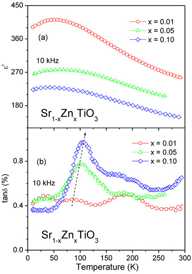 - Okhay, O.; Vilarinho, P.M.; Tkach, A. Low-temperature dielectric response of strontium titanate thin films manipulated by Zn doping. Materials 2022, 15, 859. [Google Scholar] [CrossRef]