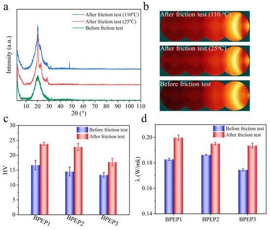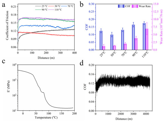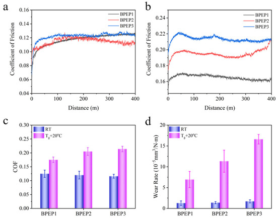 - The COF and wear rate of BPEP1 friction at Tg + 20 °C increase gradually with the decrease in crosslinking density, which is because the decrease in modulus and the increase in hydrogen bond increase the sliding resistance and adhesion caused by material deformation in the friction.