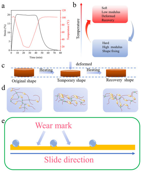 - Thermal tunable tribological behavior of BPEPs is based on the mobility varying of the polymer chain and uses the thermal of the friction interface to achieve shape recovery, which is beneficial for reducing friction coefficient and reducing wear.