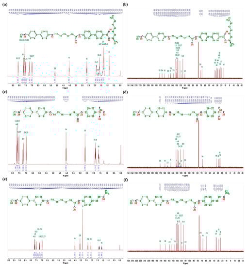 (a) 1H NMR of LC-A; (b) 13C NMR of LC-A; (c) 1H NMR of LC-D; (d) 13C NMR of LC-D; (e) 1H NMR of LC-Z; and (f) 13C NMR of LC-Z.