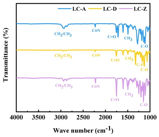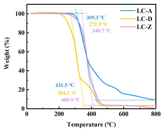 Thermal stability is an index used to evaluate the anti-decomposition and anti-aging qualities of a lubricant, and good thermal stability is necessary for lubricant additives. The thermogravimetric analysis curve of TGA is shown in Figure 6. The initial decomposition temperatures of LC-A, LC-D, and LC-Z were 309.3 °C, 271.9 °C, and 340.7 °C, respectively, mainly due to the decomposition of ether bonds and ester groups in the structure of LCs. When compared with LC-D and LC-Z, LC-A contains two ester groups in its structure, which may be the reason for its second decomposition starting at 400 °C. LC-D starts its second decomposition around 340 °C, probably due to the presence of trifluoromethyl in its molecular structure. In addition, the final decomposition temperatures of the three LCs were 431.5 °C, 354.1 °C, and 409.9 °C, respectively. The analytical results show that LCs have excellent thermal stability due to their molecular structure, having the potential to be used as lubricant additives.