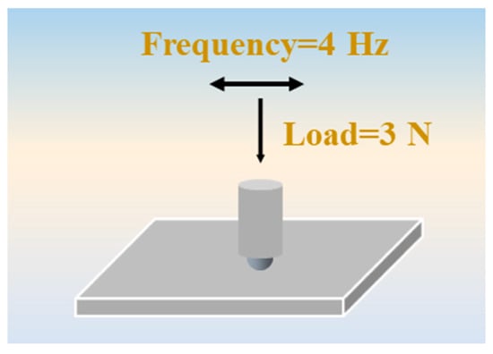 To verify the effect of the mesogenic-phase temperature ranges on the tribological properties of LCs, LCs were evaluated in a point-to-point contact mode with a UMT-TriboLab friction and wear tester (Bruker, Billerica, MA, USA). The steel ball and steel plate used in the experiment were made of 304 stainless steel, and the diameter of the steel ball was 8 mm. The experimental parameters are shown in Table 1 and the model schematic is shown in Figure 3. Tests were conducted at 25 °C, 50 °C, 75 °C, 100 °C, 125 °C, 150 °C, 175 °C, and 200 °C. Before each test, the steel ball and steel plate were sonicated using a mixture of ethanol and petroleum ether; the procedure lasted for 30 min. A computer was used to record the curve of the coefficient of friction and the sliding time. During the test, the friction-pair was completely immersed in the base oil with or without additives. Each experiment was repeated at least twice to make the experimental results accurate.