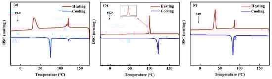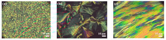 DSC and POM were used to characterize the LCs properties. DSC thermograms of the three LCs, from which the three LCs exhibit characteristics, are shown in Figure 4. LC-D exhibits the corresponding LC properties only in the heating cycle, and the mesogenic-phase temperature range is narrow. LC-A and LC-Z display mesophases as well as wide mesogenic-phase temperature ranges in both heating and cooling cycles. Therefore, compared to LC-D, LC-A and LC-Z have almost symmetrical mesophases and wider mesogenic-phase temperature ranges. From Figure 4a, LC-A shows three heat absorption peaks during the heating process. The first peak corresponds to the melting temperature (Tm), which refers to the temperature at which LC-A was melted by heat into the LC phase; the second peak indicates that the phase transition occurred in the smectic C phase of LC-A; and the third peak shows the disappearance of the LC phase while entering the isotropic liquid phase, which is indicated using the clearing point (Td). LC-D and LC-Z have two heat absorption peaks, corresponding to Tm and Td, respectively. The phase-transition temperature and the mesogenic-phase temperature range of the three LCs during the heating process are shown in Table 2. The Tm of LC-A, LC-D, and LC-Z are 33.7 °C, 100.5 °C, and 37.8 °C, respectively. Depending on the mesophase temperature range, the order of the LCs is LC-A > LC-Z > LC-D, which is closely related to the molecular structure of the LCs. When compared with LC-D, LC-A and LC-Z show superior LC properties due to their longer chain lengths. Moreover, the two ester groups in the LC-A structure make it easier to form a smectic phase with a wider mesogenic-phase temperature range. Figure 5 shows the optical textures of the LCs, which were observed using POM. From Figure 5a, LC-A shows a schlieren texture at 65.9 °C. From Figure 5b, LC-D exhibits a fan-shaped focal conic texture at 100.6 °C, while Figure 5c shows the focal conic texture of LC-Z at 56.5 °C. The three synthetic LCs exhibit a colorful LC texture.