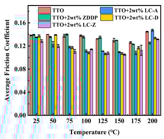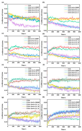 The friction coefficients of TTO and TTO containing 2 wt% ZDDP, LC-A, LC-D, and LC-Z at different temperature points: (a) at 25 °C; (b) at 50 °C; (c) at 75 °C; (d) at 100 °C; (e) at 125 °C; (f) at 150 °C; (g) at 175 °C; and (h) at 200 °C.