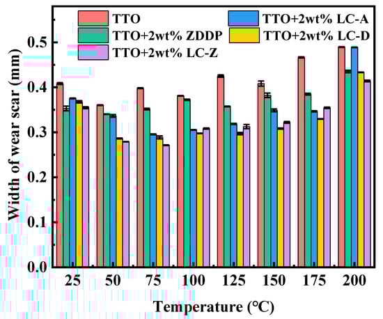 The width of the wear scar was characterized by a Contour GT-K 3D profiler to illustrate the anti-wear performance of LCs as lubricant additives. The average of the three measurements was calculated to illustrate the width of the wear scars. The results are shown in Figure 9. All LC additives exhibited superior anti-wear performance at different temperatures when compared with TTO. Even at 50–175 °C, the anti-wear performance of the three LC additives was significantly better than that of the commercially available additive ZDDP. It is noteworthy that, compared with LC-D, the addition of LC-Z resulted in a smaller width of wear marks on the steel plate over a wide temperature range of 25 to 75 °C. Among them, the width of wear marks at 75 °C was reduced by 31.82%. The addition of LC-A can also significantly improved the anti-wear performance of the oil, with a 25.78% reduction in the width of wear marks at 75 °C, which may be caused by the longer chain length of LC-A and LC-Z, resulting in wide-mesophase temperature ranges. It can be seen from Figure 9 that LC-D has good anti-friction properties throughout the temperature range, especially at 125 °C, with a 30.07% reduction in width of the wear scars, which is probably due to the presence of trifluoromethyl in its structure. In addition, the three LC additives can dramatically enhance the anti-wear performance of TTO in a wide temperature range of 25 to 175 °C, which is consistent with the following conclusion: the temperature interval in which the LC additives have tribological performance effects is wider than their mesophase temperature ranges. Therefore, the chemical structure and mesophase temperature ranges of LC additives are critical factors affecting their anti-wear performance.