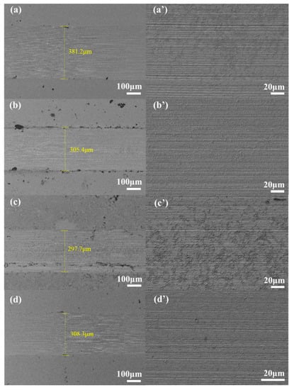 The morphology of the wear surface was further observed with SEM. Figure 10 shows the SEM images and the width of wear scars at 100 °C. As can be seen from Figure 10, the wear scars were deeper with pure TTO lubrication and an obvious furrow appeared, indicating that no stable lubrication film was formed on the wear surface. The addition of LC additives can reduce the degree of wear on the wear surface and form a stable lubricating film, so as to improve the anti-wear properties of the base oil. The width of the wear marks of pure TTO is 381.2 μm, and the width of the wear marks of the three LC additives are 305.4 μm, 297.7 μm, and 308.3 μm, respectively. Compared to pure TTO, the anti-wear effects of LCs are 19.89%, 21.88%, and 19.11%, respectively. The anti-wear effect of LC-A is better than LC-Z, which was in line with the mesophase temperature ranges. The anti-wear effect of LC-D was significantly better than the other two LC additives, which was probably due to the presence of trifluoromethyl in its structure, which forms a stable lubricating film and leads to the improvement of the anti-wear properties of the oil. It can be seen from Figure 10c,c’, that there was a slight corrosive wear on the wear surface of LC-D, which may be due to the chemical reaction between the free fluorine atoms and iron elements on the wear surface.