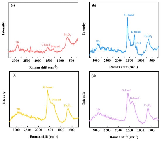 Raman spectra at wear marks after UMT: (a) TTO; (b)TTO + 2 wt% LC-A; (c) TTO + 2 wt% LC-D; and (d)TTO + 2 wt% LC-Z.